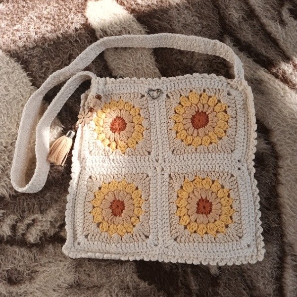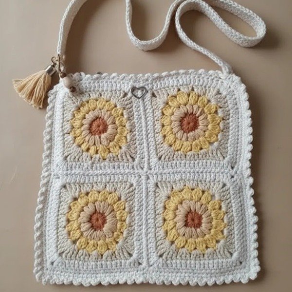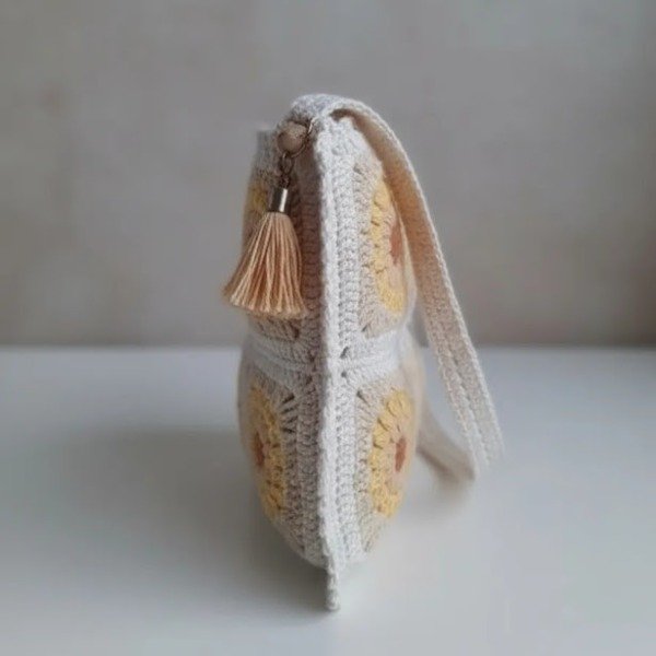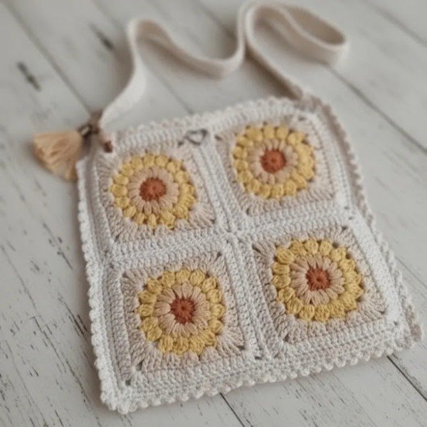 Cartera - bandoletara tejida al crochet en algodón color crudo, con diseño de flores, en colores claros. Medidas: 23cm de alto, 23cm de ancho, tira de 34cm largo.