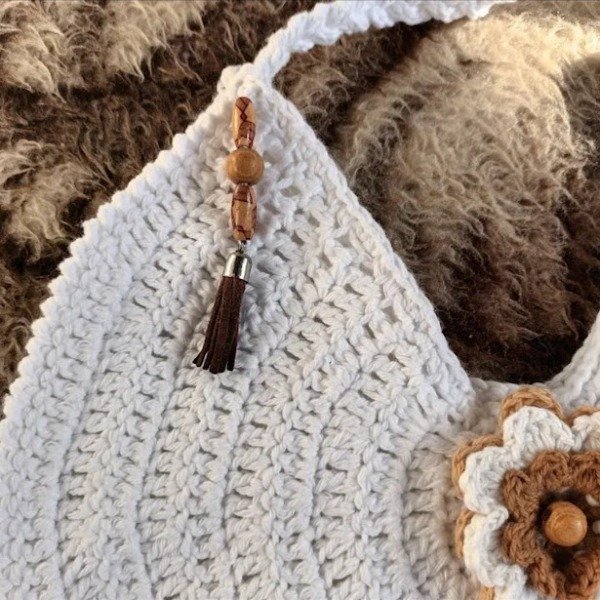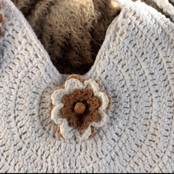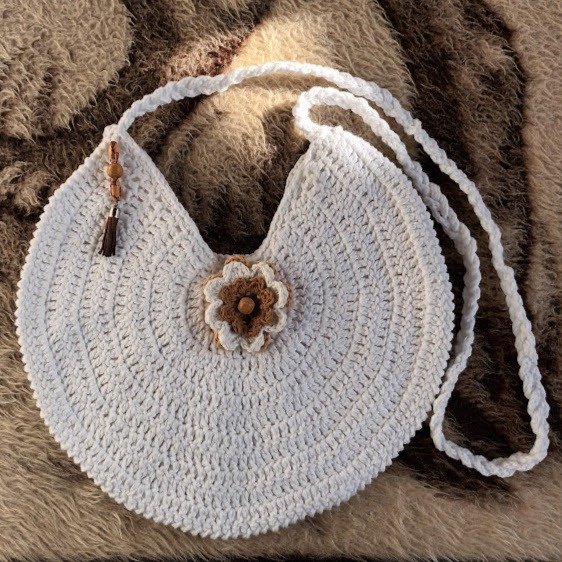 Cartera circular tejida al crochet en algodón blanco. Con tira para y adorno de flor en el centro. Medidas: 25cm de largo en los costados, 16cm de largo en el centro, 28cm de ancho, tira de 44cm de largo.