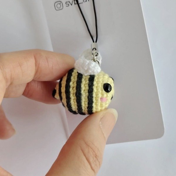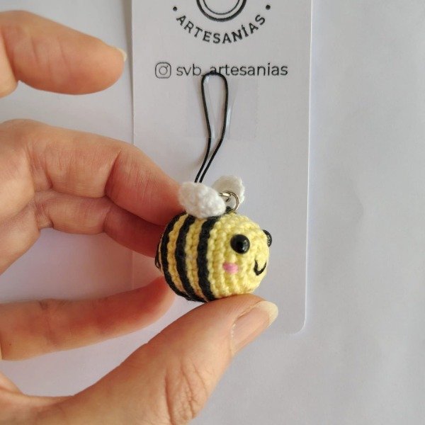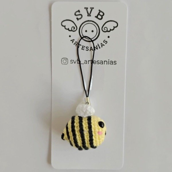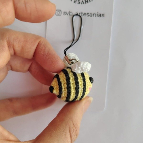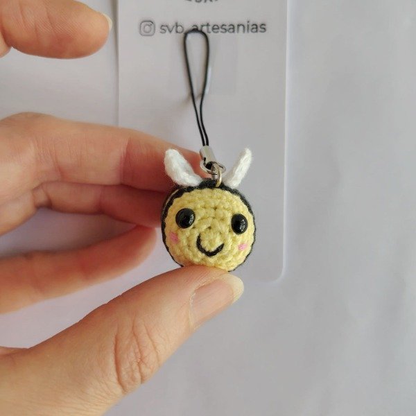 Mini abejita amarillo pastel tejida a crochet. Ideal como colgante para celular o adorno para árbol de navidad. Medidas del amigurumi: 3,5 cm x 3,5 cm x 2,5 cm. La correa mide 6 cm.