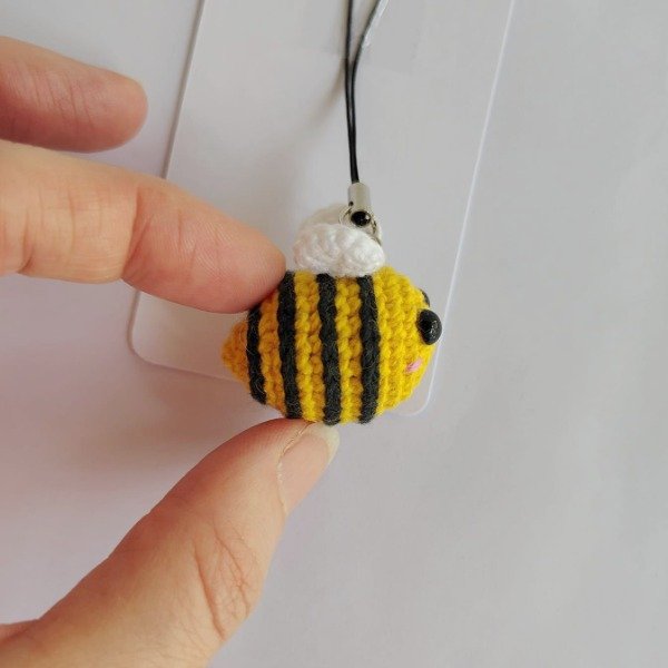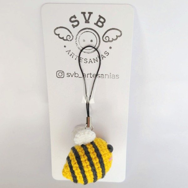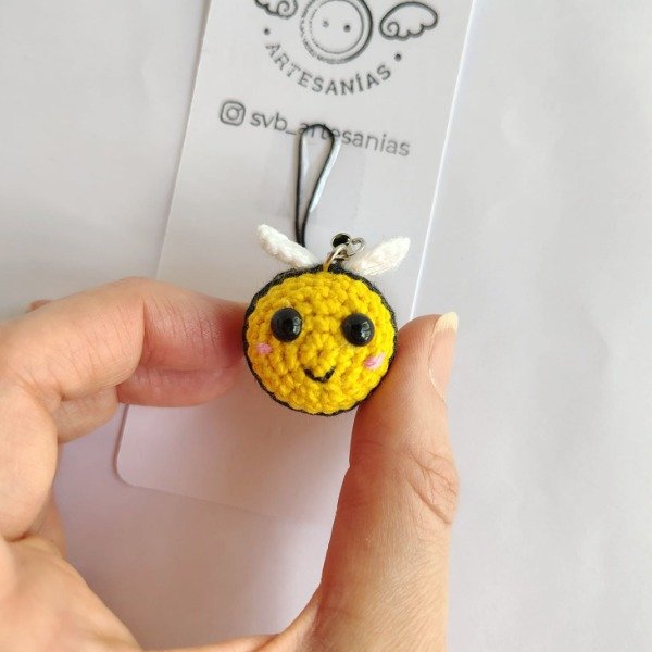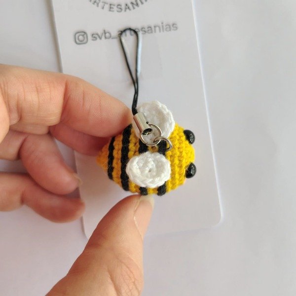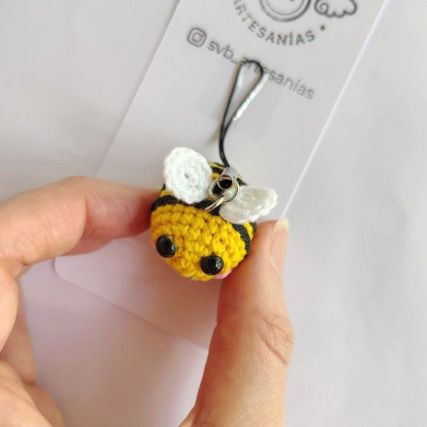 Mini abejita tejida a crochet. Ideal como colgante para celular o adorno para árbol de navidad. Medidas del amigurumi: 3,5 cm x 3,5 cm x 2,5 cm. La correa mide 6 cm.
