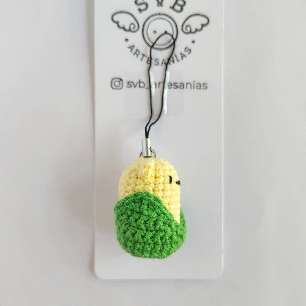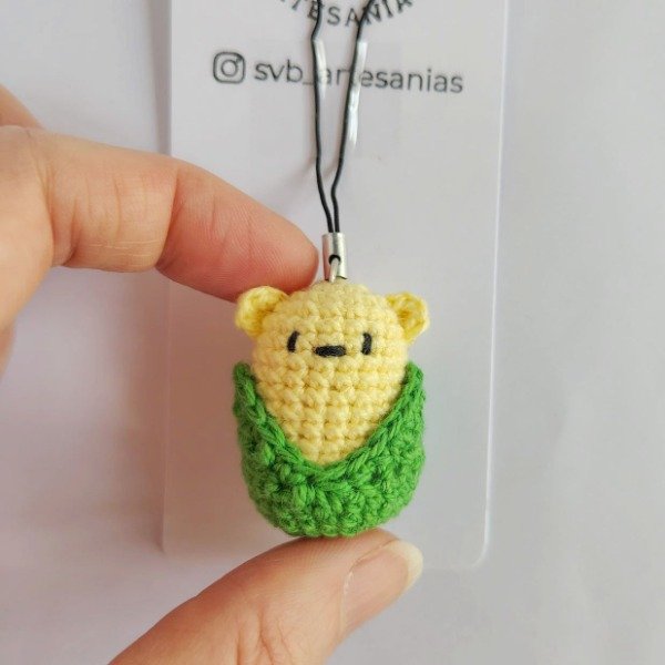 Mini osito maiz tejido a crochet. Ideal como colgante para celular o adorno para árbol de navidad. Medidas del amigurumi: 4 cm x 3 cm x 2.5 cm La correa mide 6 cm.