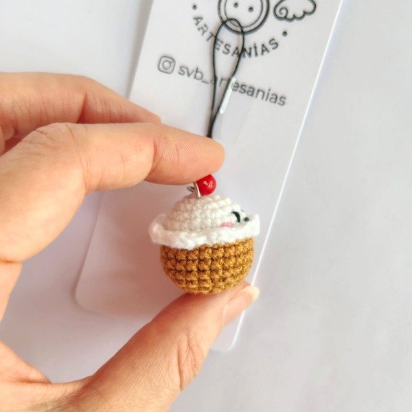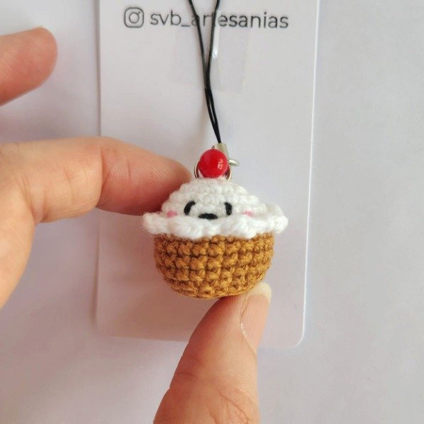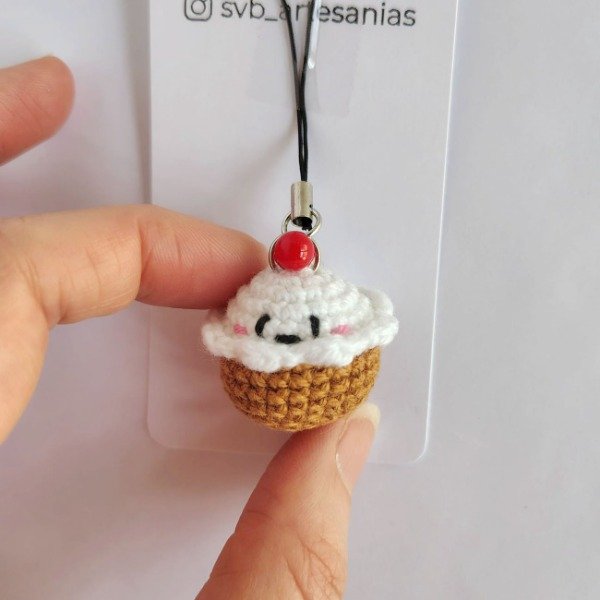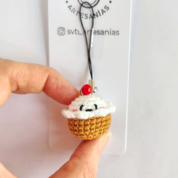 Mini pastelito tejido a crochet. Ideal como colgante para celular o adorno para árbol de navidad. Medidas del amigurumi: 3 cm x 3 cm x 3 cm. La correa mide 6 cm.