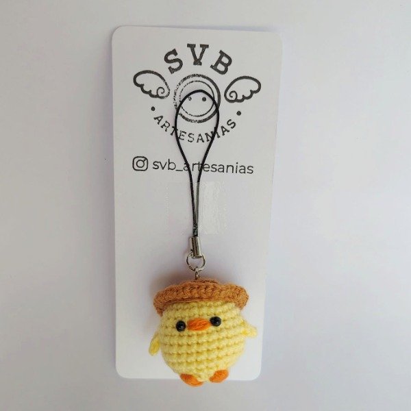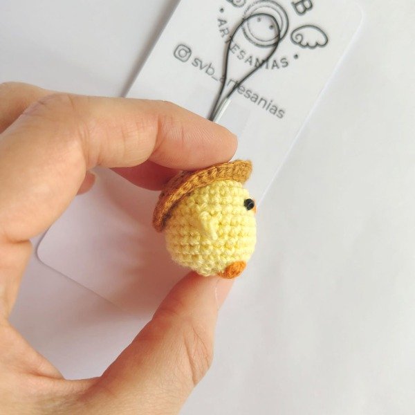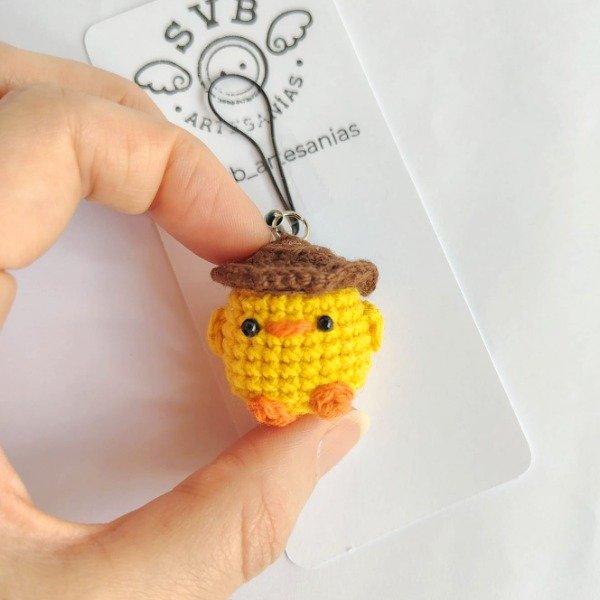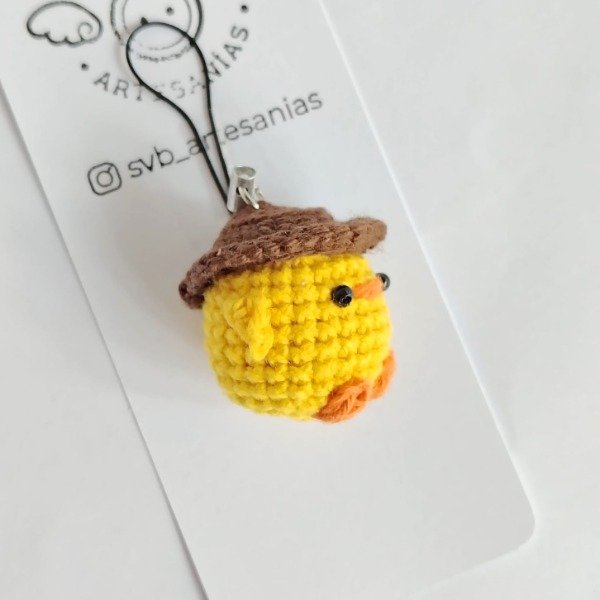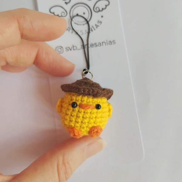 Mini pollito con gorro vaquero tejido a crochet. Ideal como colgante para celular o adorno para árbol de navidad. Medidas del amigurumi: 3,5 cm x 3,5 cm x 3 cm. La correa mide 6 cm.