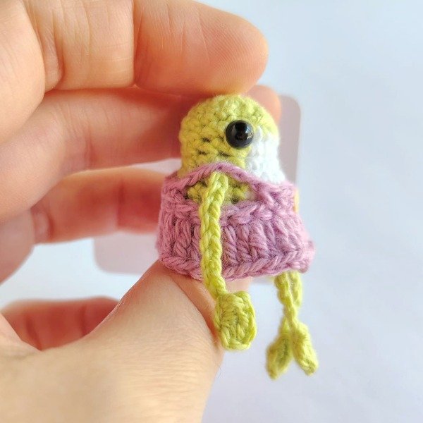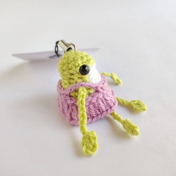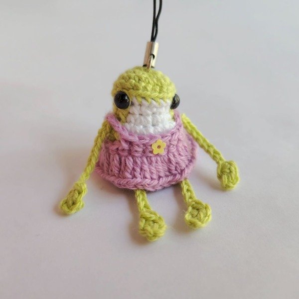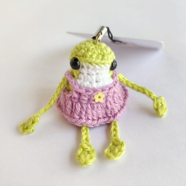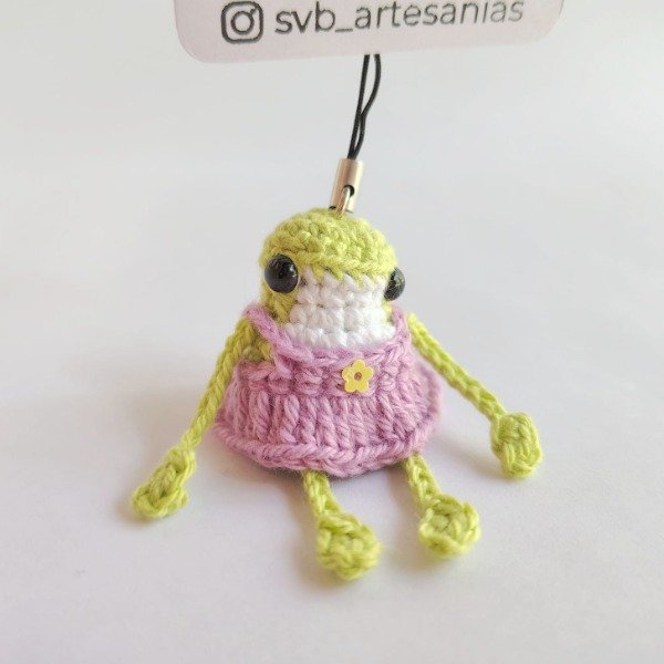 Mini ranita con vestido lila tejida a crochet. Ideal como colgante para celular o adorno para árbol de navidad. Medidas del amigurumi: 5,5 cm x 4 cm x 3 cm La correa mide 6 cm.