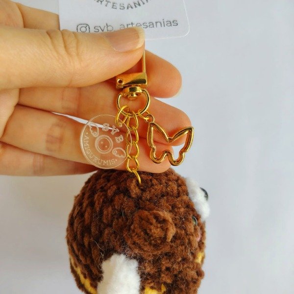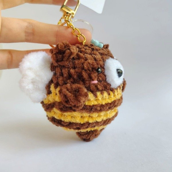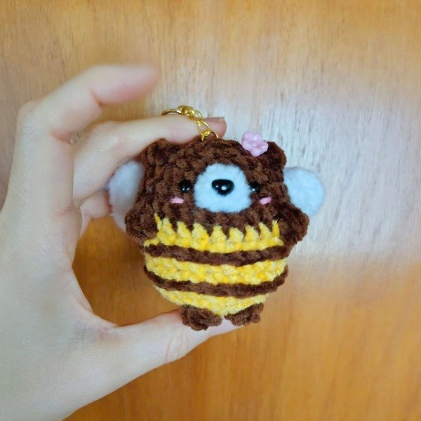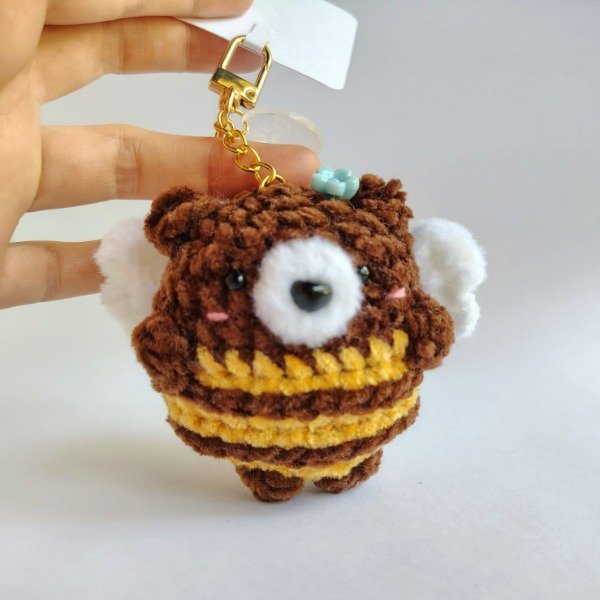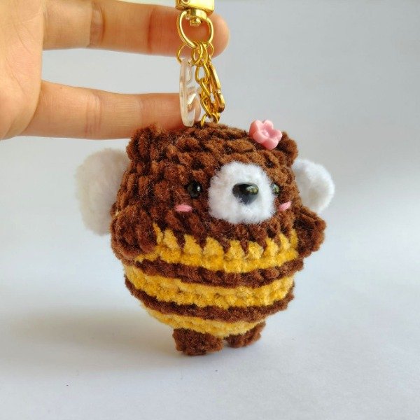 Llavero amigurumi de adorable osito con traje de abeja, confeccionado con hilo de chenille, mosquetón y dije dorados. Ideal para las llaves o para decorar bolsos y mochilas. Medidas del llavero: 13 cm x 9 cm.