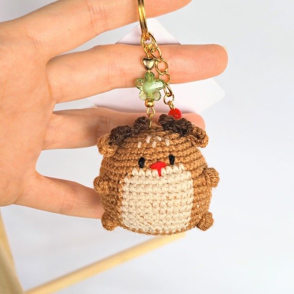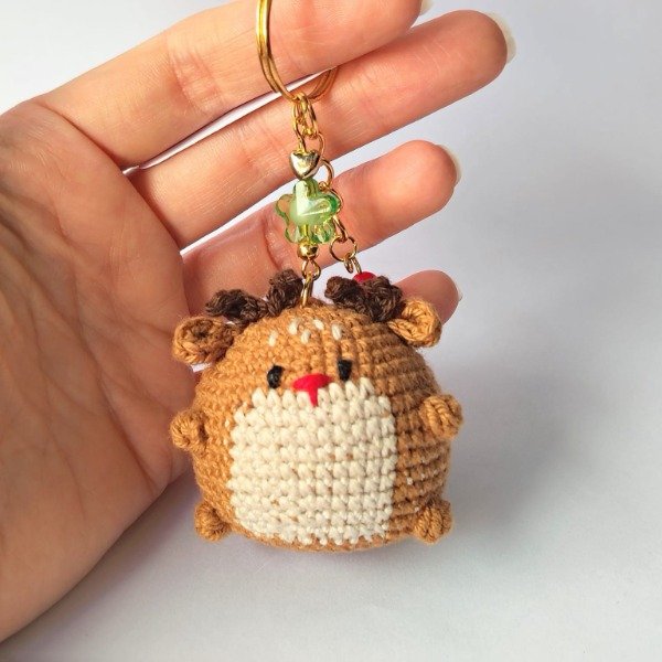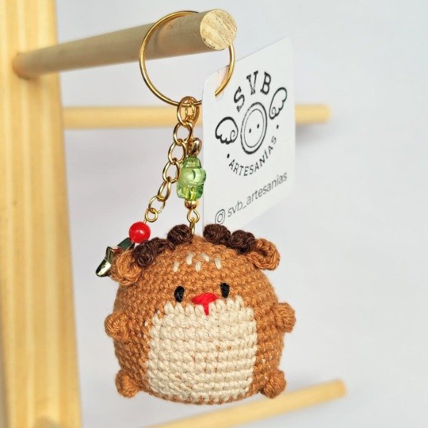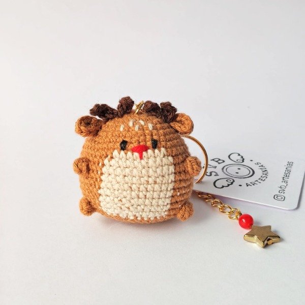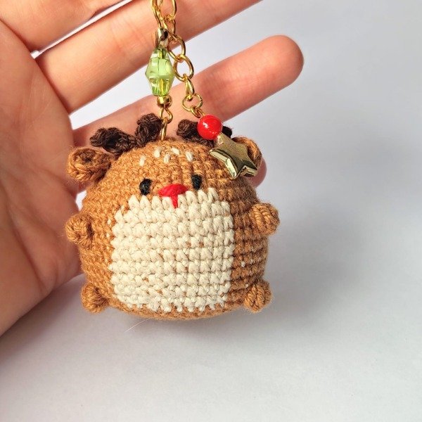 Llavero de reno. Amigurumi tejido a crochet en hilo de algodón fino. Diseño con dijes dorados y cuentas de colores. Ideal para las llaves, decorar bolsos y mochilas o colgar del árbol de navidad. Medidas del llavero: 10 cm x 5 cm.