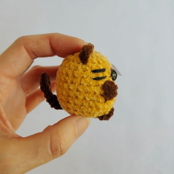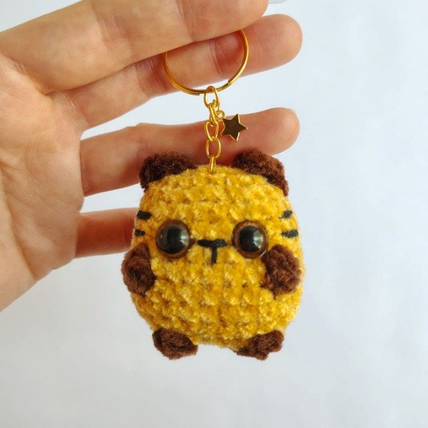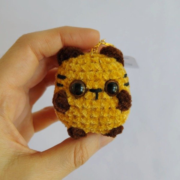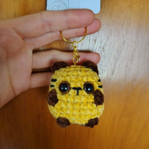 Llavero amigurumi de adorable gatito amarillo y marrón, confeccionado con hilo de chenille, gancho y dije dorados. Ideal para las llaves o para decorar bolsos y mochilas. Medidas del llavero: 10 cm x 5 cm.
