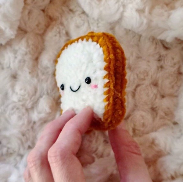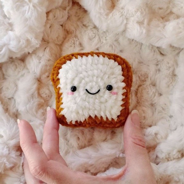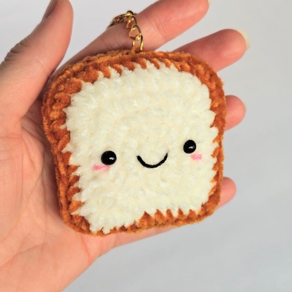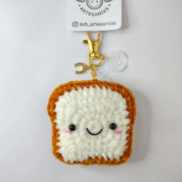 Llavero amigurumi de adorable tostada, confeccionado con hilo de chenille, mosquetón y dije dorados. Ideal para las llaves o para decorar bolsos y mochilas. Medidas del llavero: 13 cm x 7,5 cm.