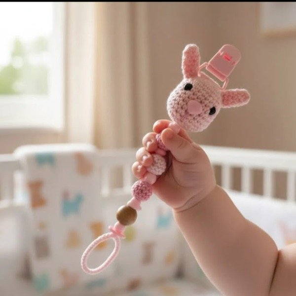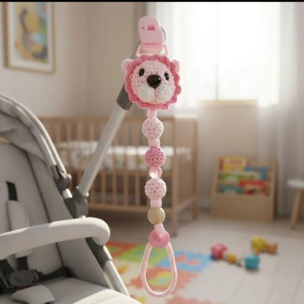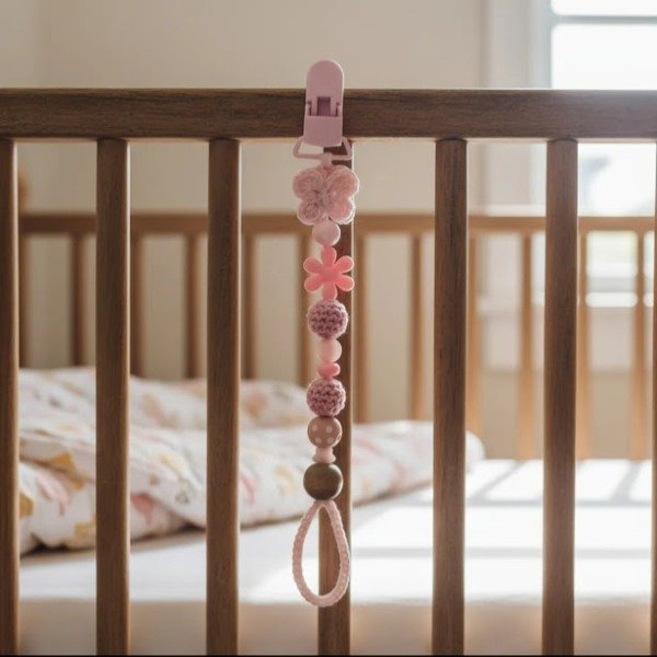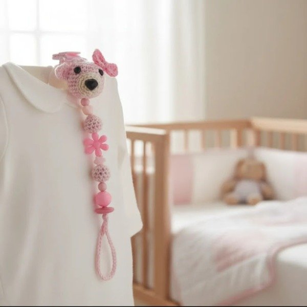 Porta chupetes tejidos al crochet en algodón rosa para bebas. Decorados con perlitas. Varios modelos. Medidas: 22cm de largo, 5cm de ancho.