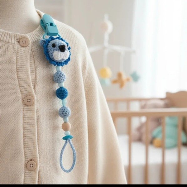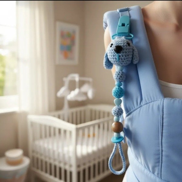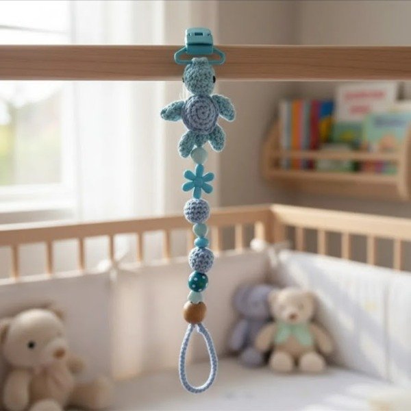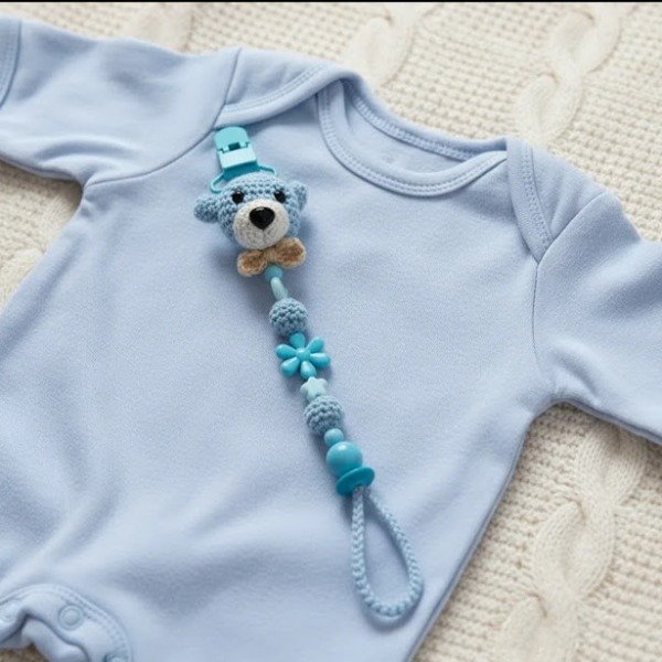 Porta chupetes tejidos al crochet en algodón celeste. Decorados con perlitas. Varios modelos. Medidas: 22cm de largo.