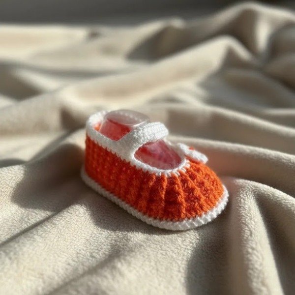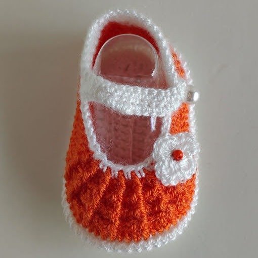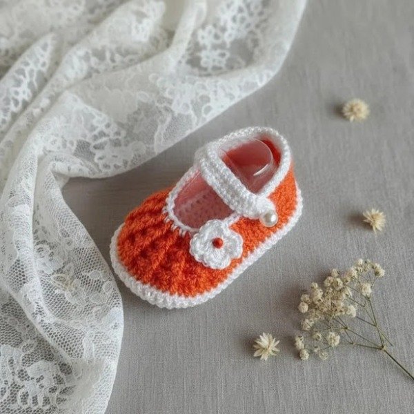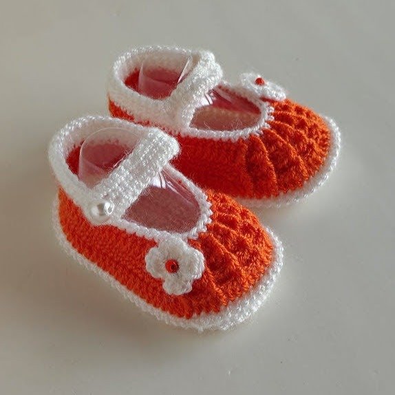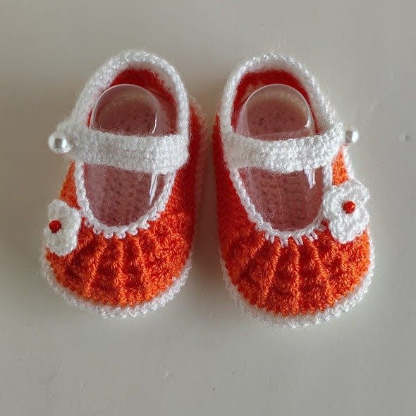 Zapatitos para bebas de 1 a 3 meses. Tejidos a crochet en color naranja y blanco, decorados con una flor y perlas como broche. Medidas del zapatito: 9cm de largo x 5cm de ancho.