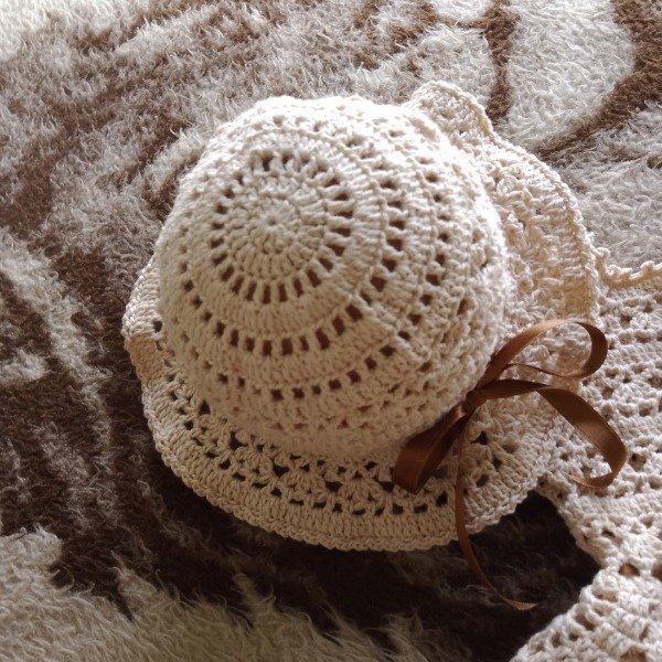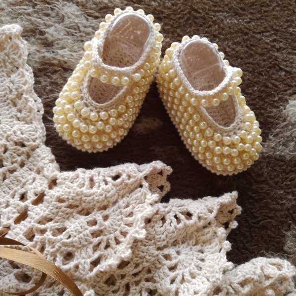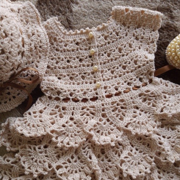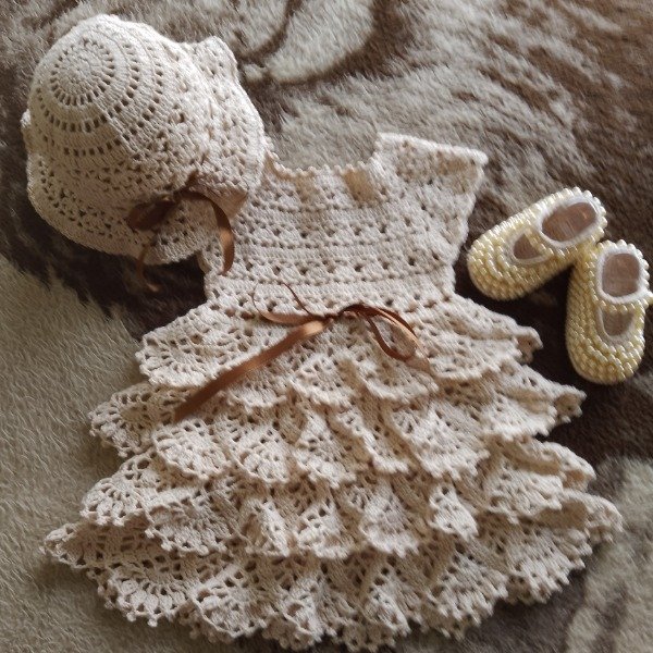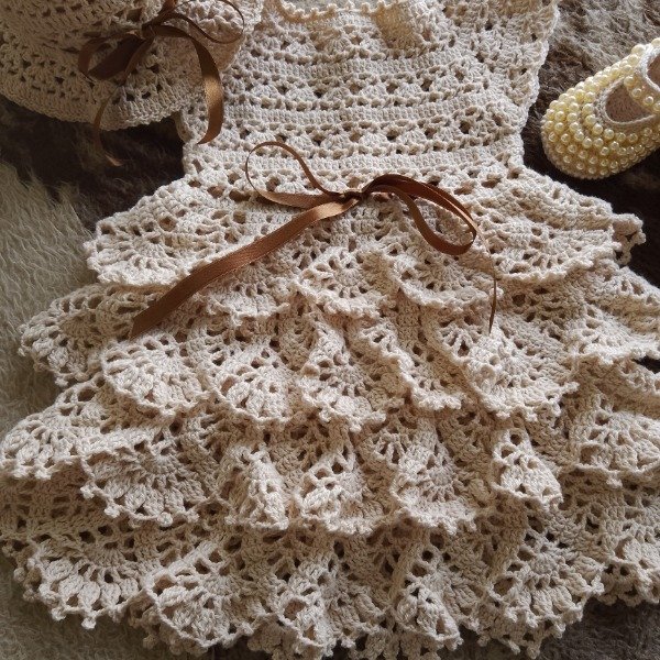 Conjunto tejido a crochet con hilo de algodón fresco e hipoalergénico, compuesto de: vestido beige con cuatro volados y cinta de raso tostado + capelina + zapatitos perlados. Ideal para fiestas o bautismo.