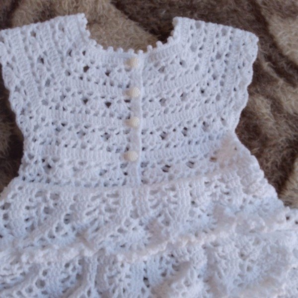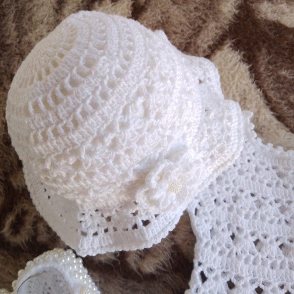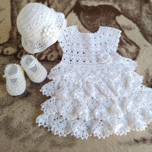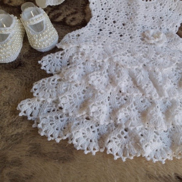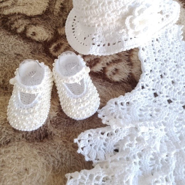 Conjunto tejido a crochet con hilo de algodón fresco e hipoalergénico, compuesto de: vestido con cuatro volados + capelina + zapatitos perlados. Ideal para fiestas o bautismo.