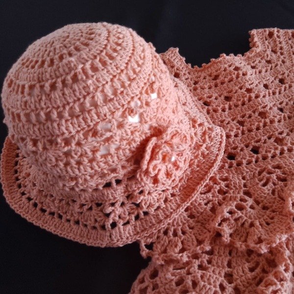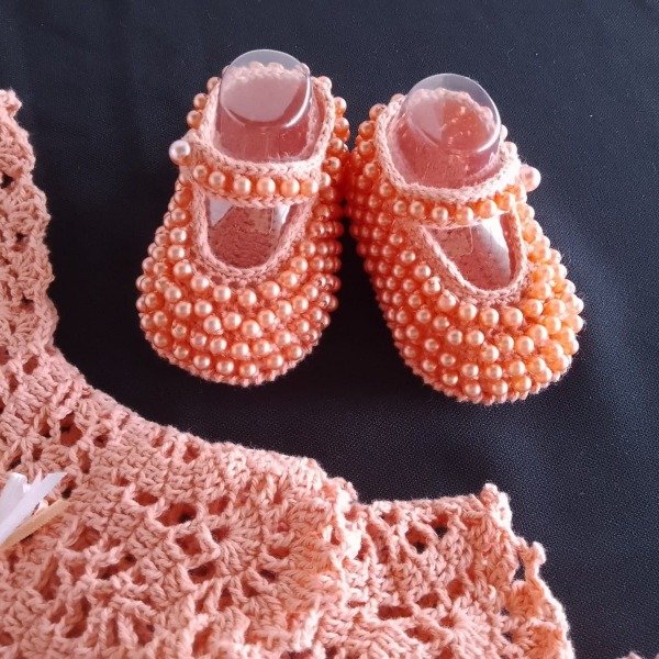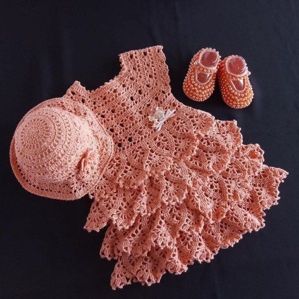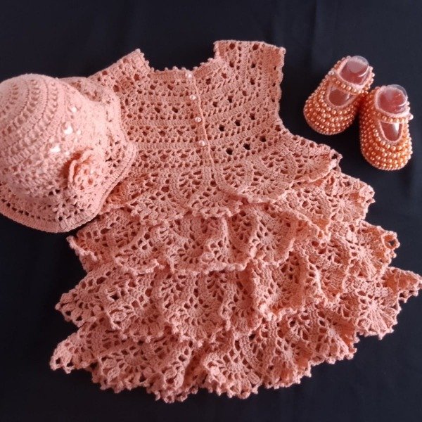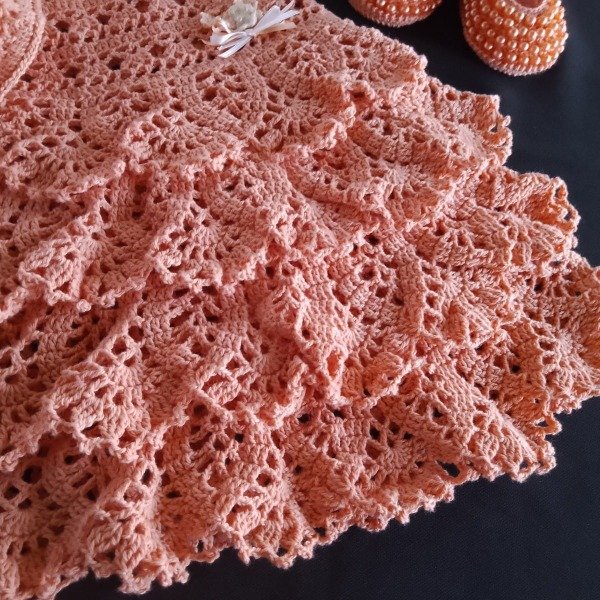 Conjunto tejido a crochet con hilo de algodón fresco e hipoalergénico, compuesto de: vestido con cuatro volados + capelina + zapatitos perlados. Ideal para fiestas o bautismo.