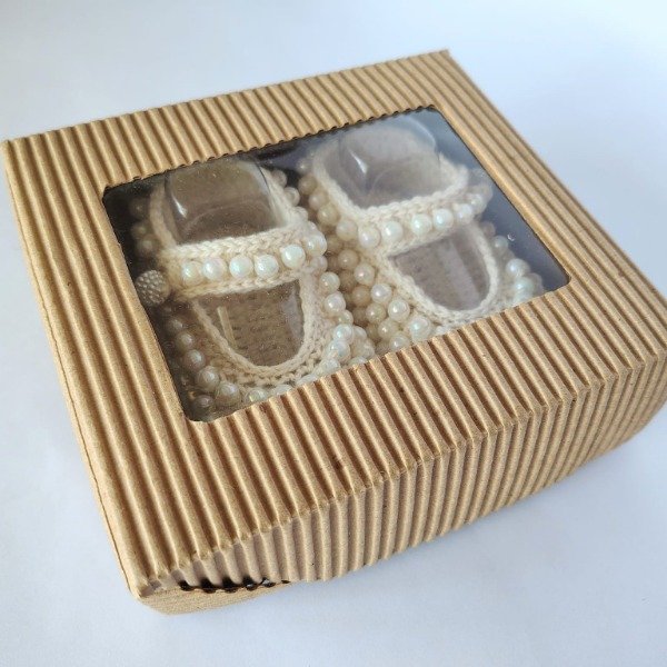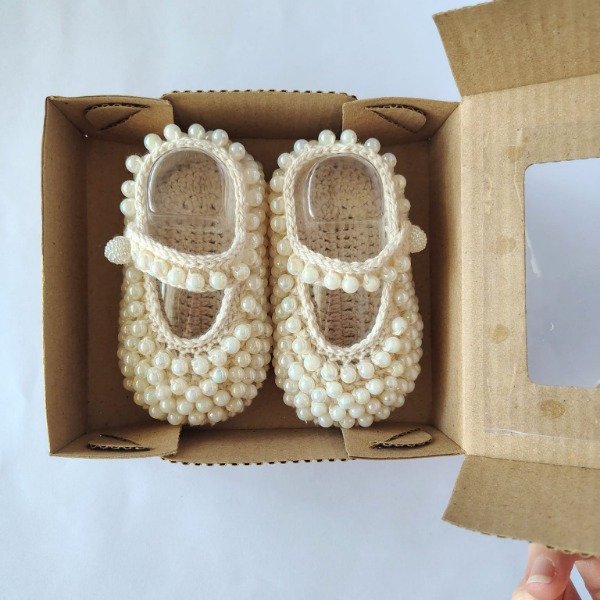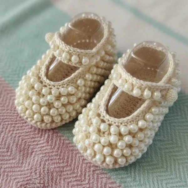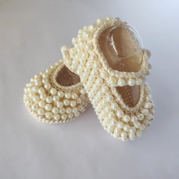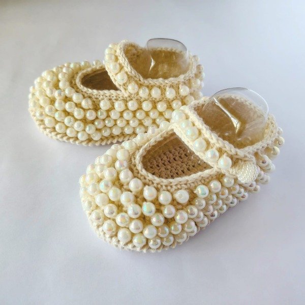 Zapatitos a crochet con perlas entretejidas. Para bebé de 3a6 meses