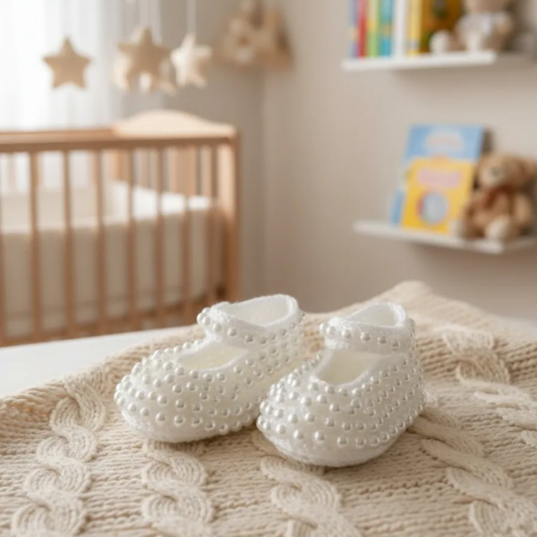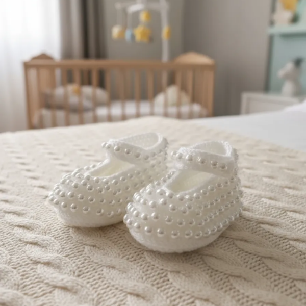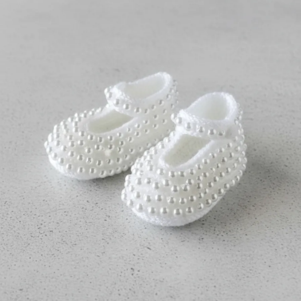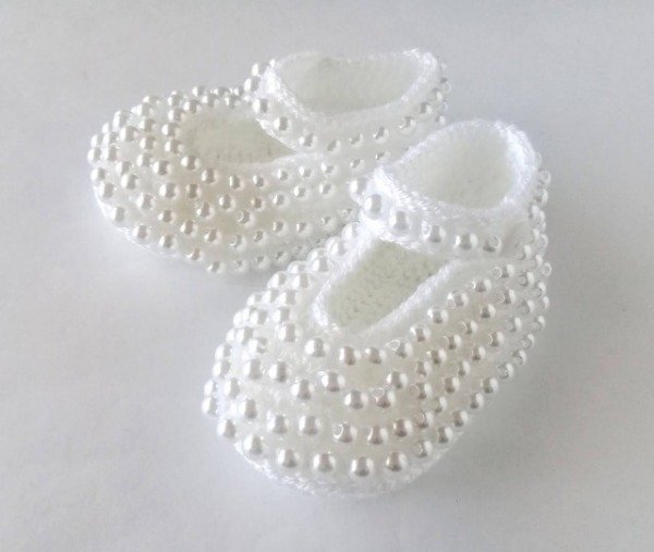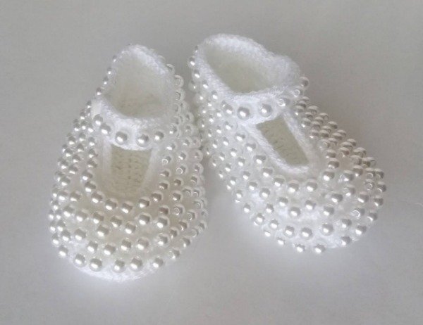 Zapatitos a crochet con perlas entretejidas. Para bebé de 3 a 6 meses.