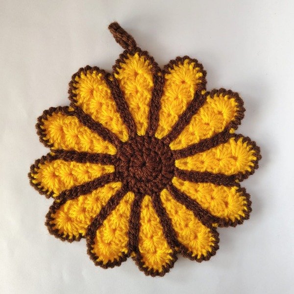 Agarradera para cocina de flor tejida a crochet. Medidas: 23 cm x 21 cm