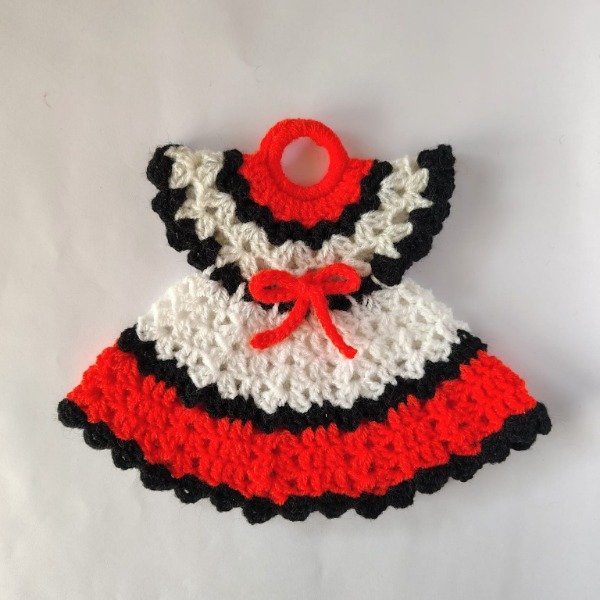 Agarradera para cocina de adorable vestido tejida a crochet. Doble capa de tejido. Medidas: 16 cm x 20 cm