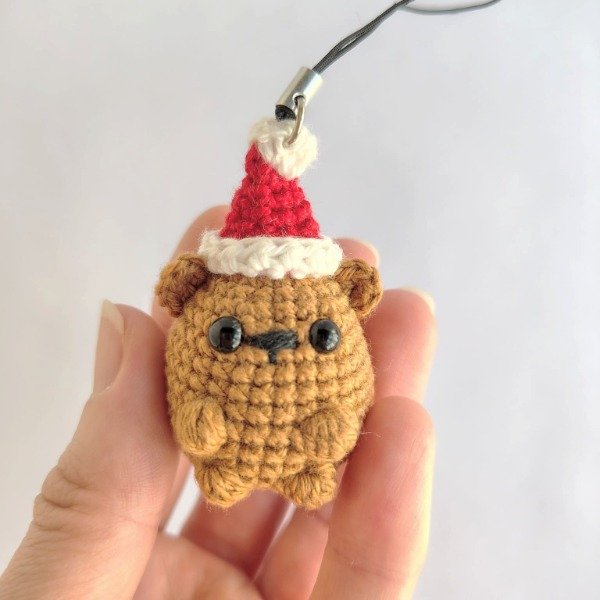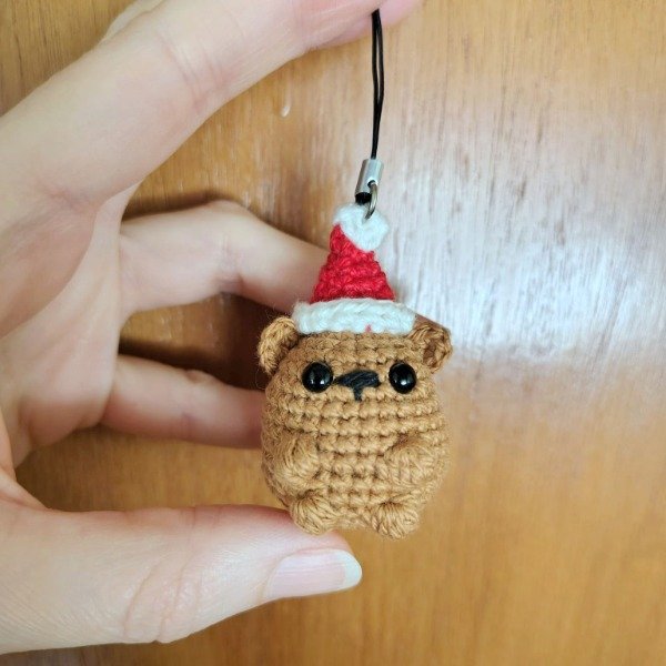 Mini osito marrón navideño con gorro tejido a crochet. Adorno para el árbol de navidad o colgante de celular. Medidas del colgante entero: 10 cm x 3 cm