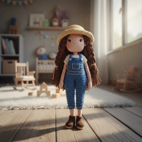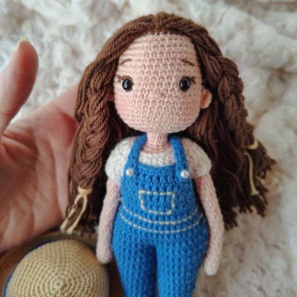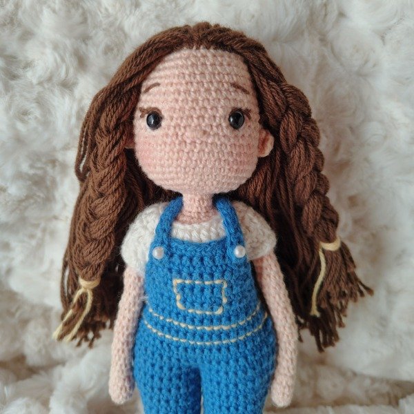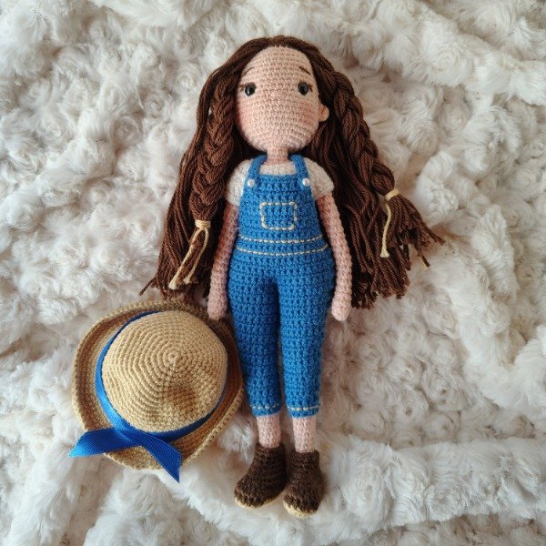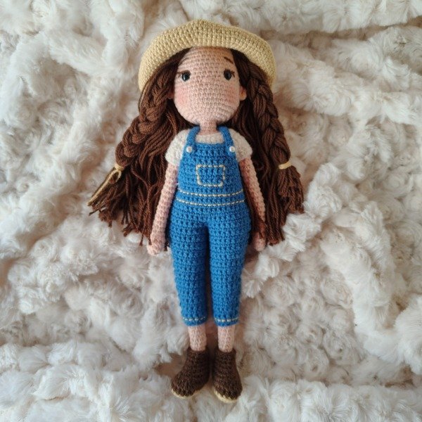 Muñeca campesina amigurumi tejida a crochet con hilo fino de algodón. Sus medidas son de 23 cm de alto por 10 cm de ancho.