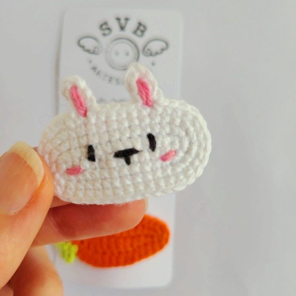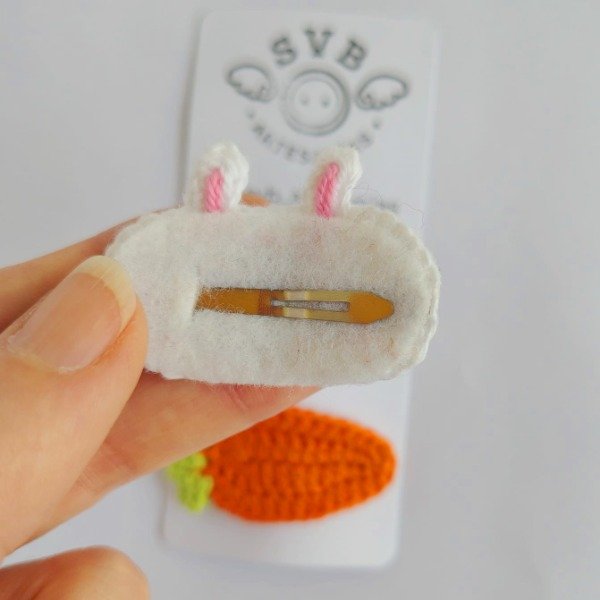 Par de hebillas para el pelo de conejito blanco y zanahoria tejidas a crochet. Ideales para niñas. Medidas de cada hebilla: 5 cm x 3 cm.